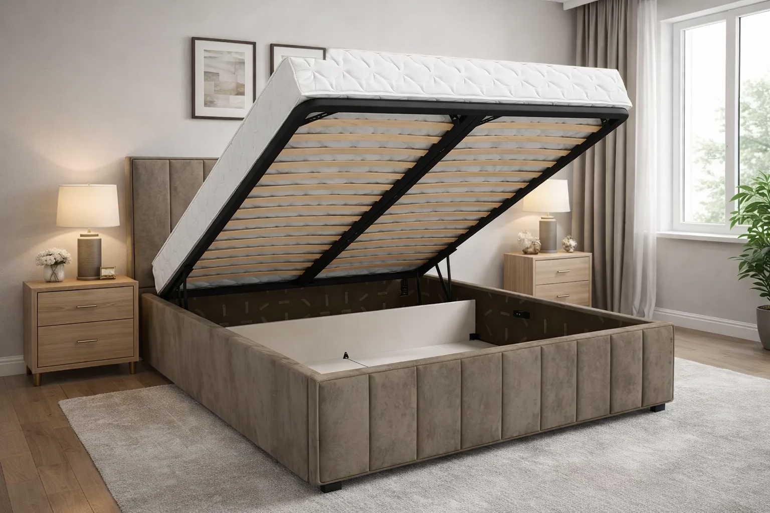 Один из самых популярных вариантов - подъёмный механизм. Основание поднимается вверх, открывая доступ к вместительному коробу. Такое решение удобно для хранения сезонных вещей, постельного белья или текстиля, который не используется ежедневно.