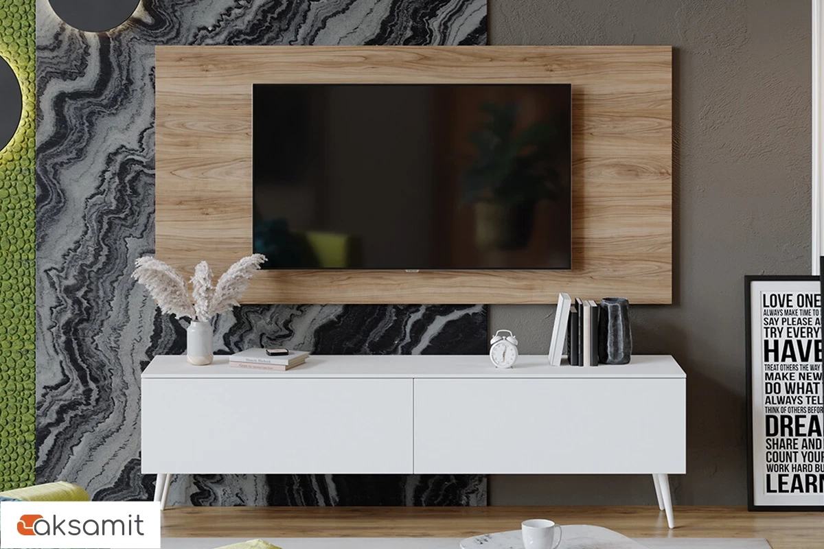 Модульность. Тумба под ТВ имеет вместительные ящики для хранения, а шариковые направляющие позволят плавно и бесшумно открывать их и закрывать. В конструкции ТВ тумбы использована комбинированная система открывания, где установлена система push-to-open и имеется возможность открывания с помощью захвата рукой снизу. Шкаф навесной также открывается с помощью захвата рукой снизу. Панель для ТВ, стеллаж навесной и металлические опоры являются универсальными модулями, которыми, при необходимости, можно дополнить композицию.